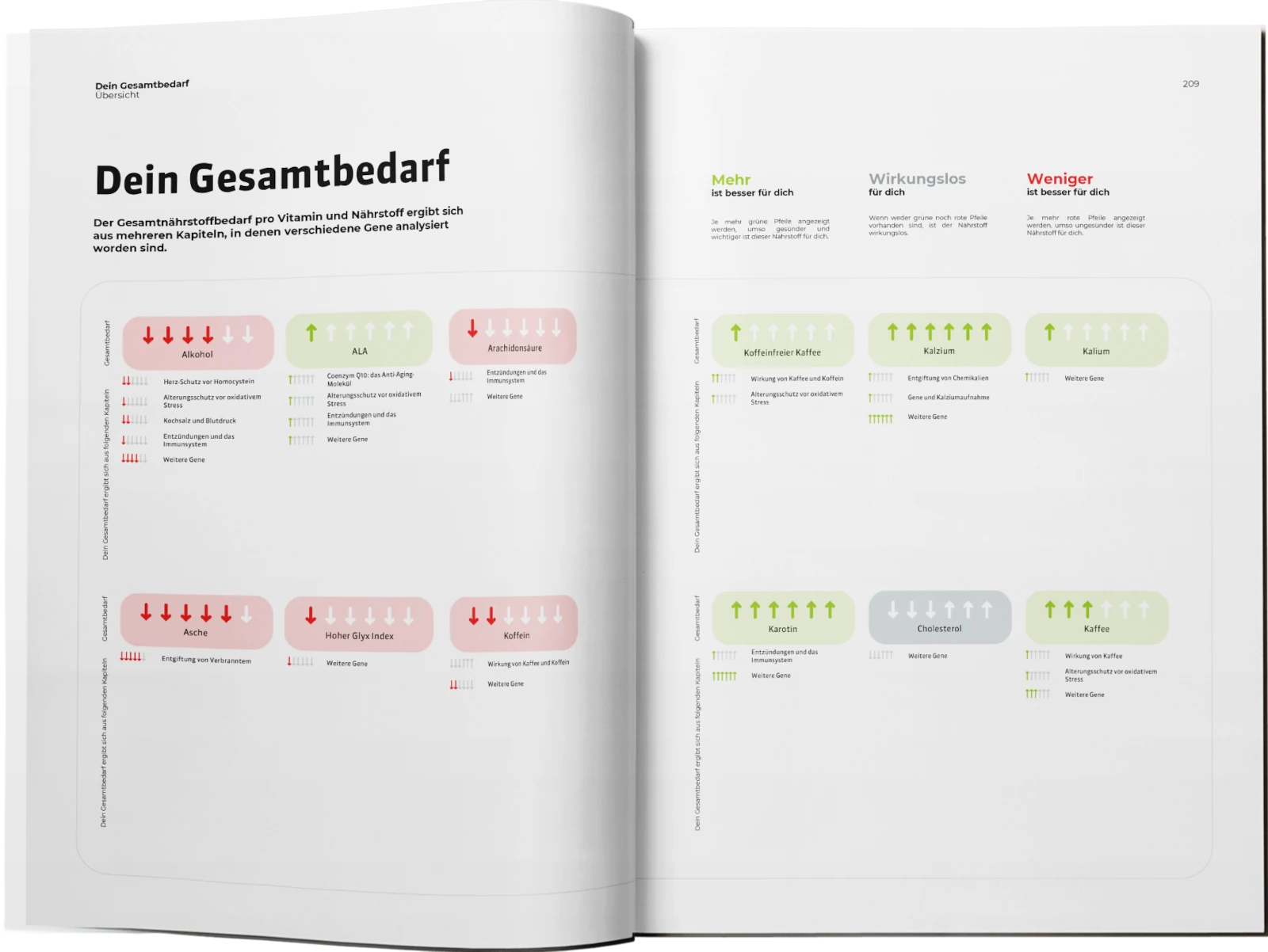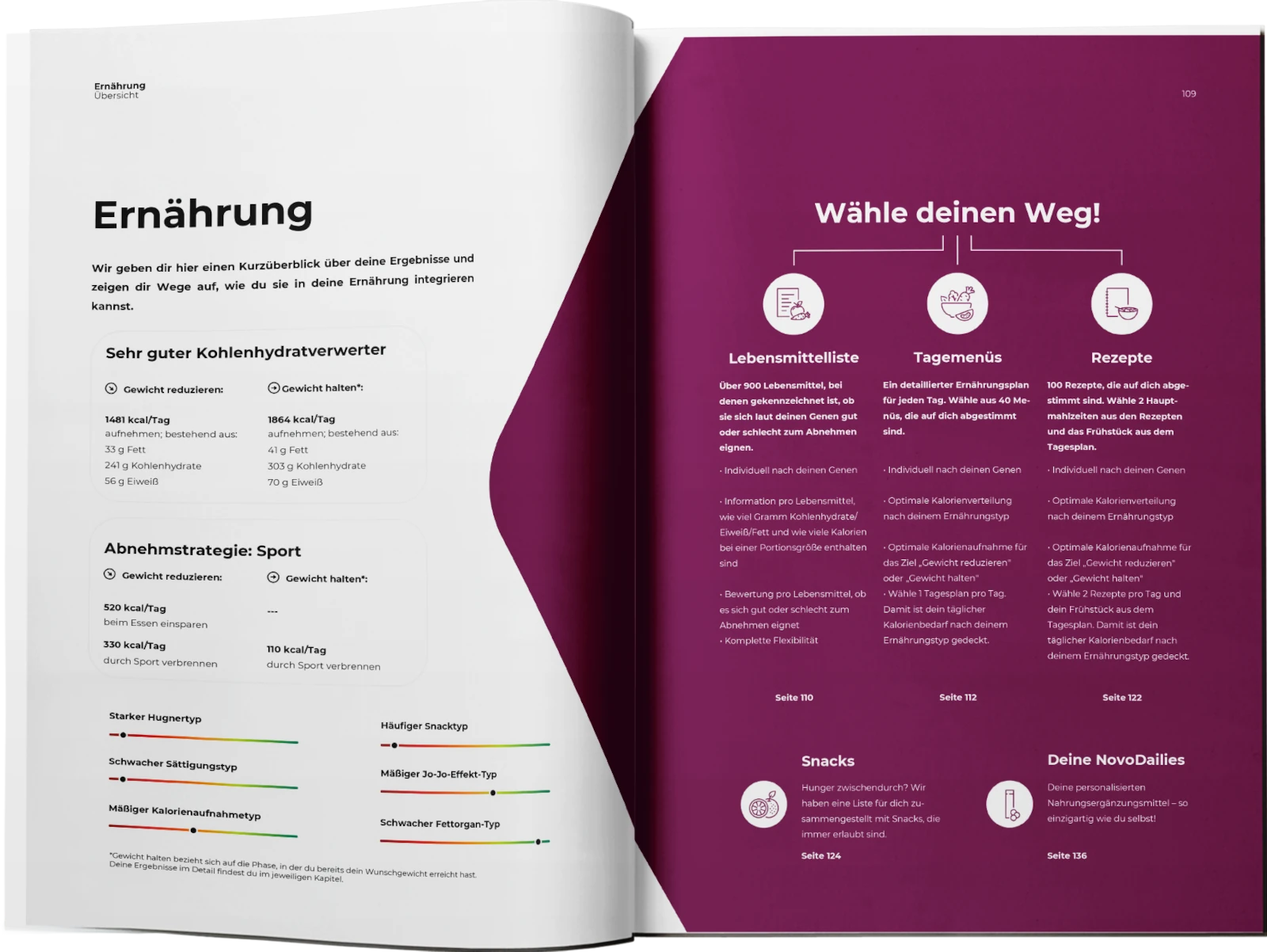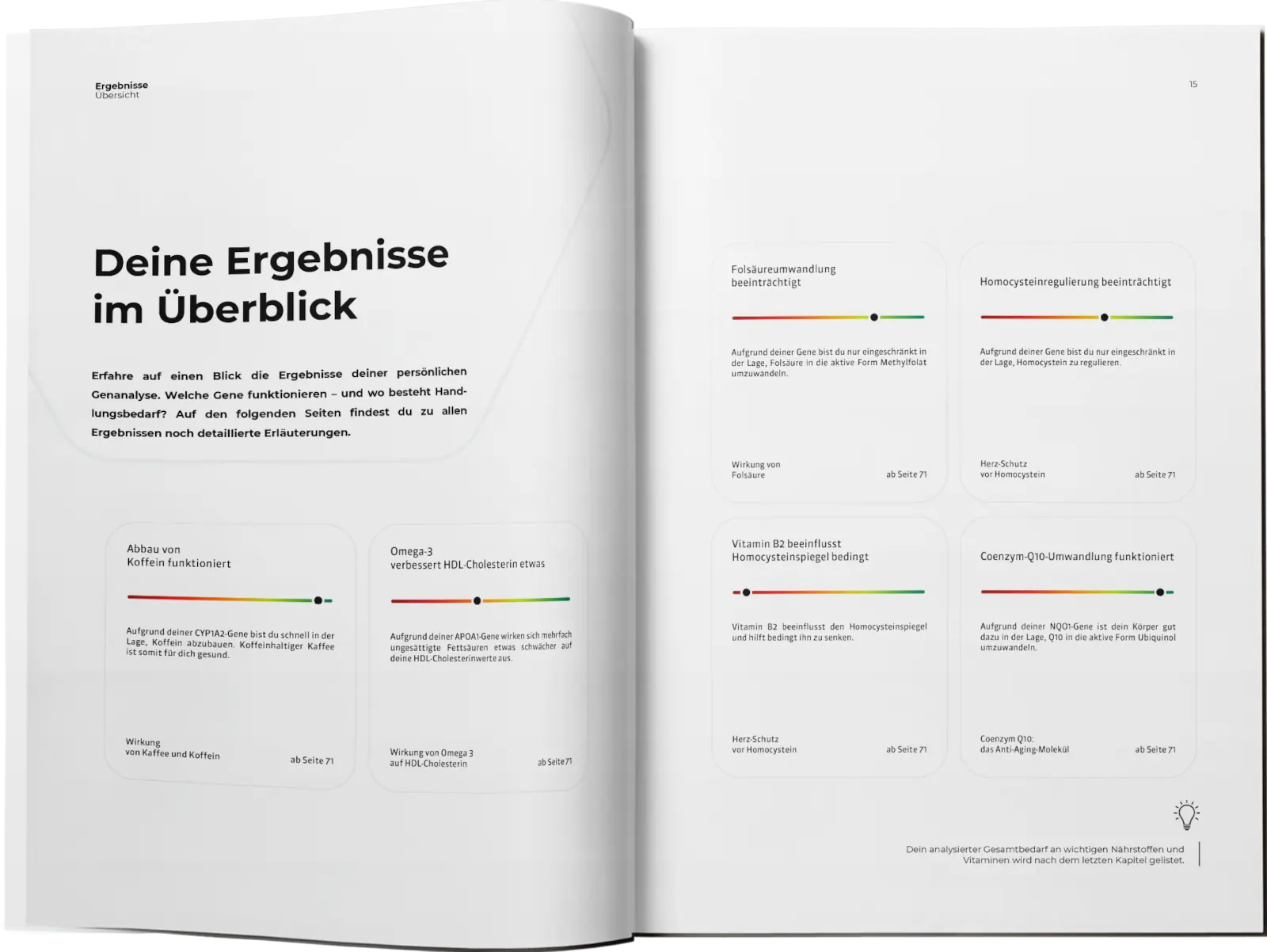 Nach Abschluss aller Analysen können wir detaillierte Berichte erstellen. Diese bieten dir einzigartige Einblicke in deine Genetik. Außerdem fließen die Ergebnisse in die Rezepturen der personalisierten Nährstoffmischungen von NovoDaily Standard und NovoDaily Premium ein.