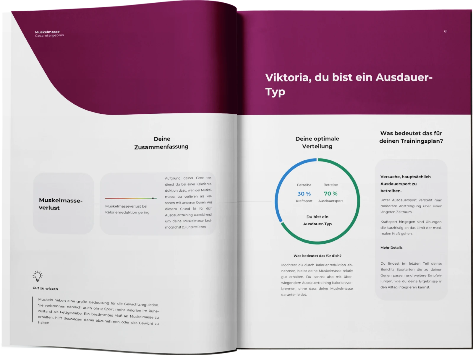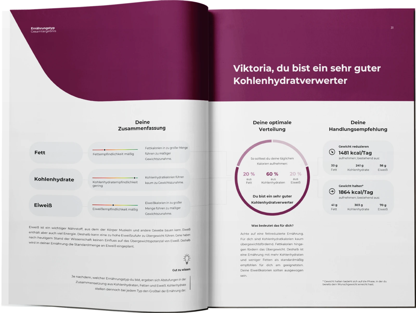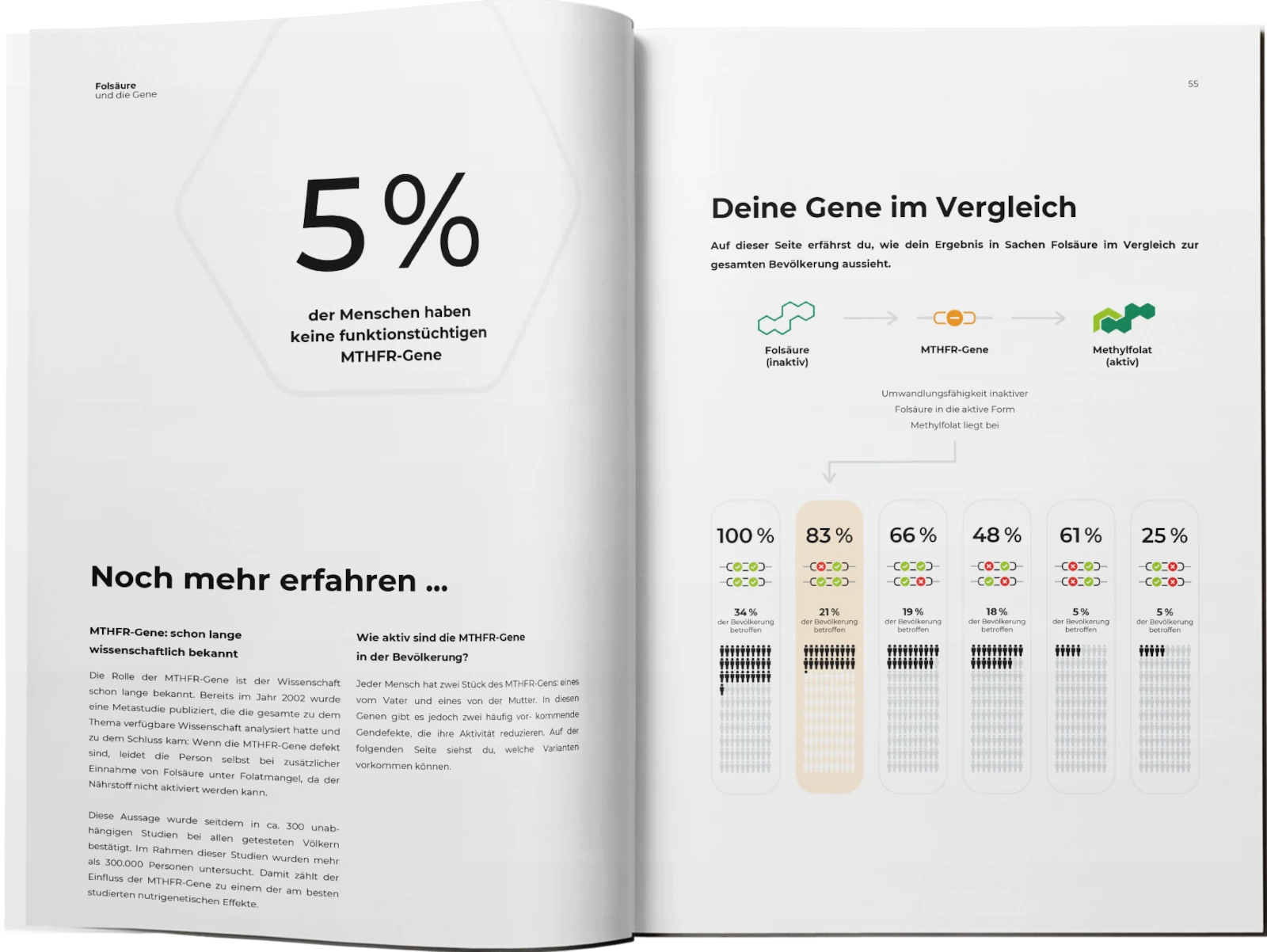 Die Ergebnisse vergleichen wir mit dem aktuellen Stand der Wissenschaft. So können wir dir wertvolle Einsichten liefern, wie die Nahrung mit deinen Genen interagiert. Du erhältst von uns einen ausführlichen Bericht mit konkreten Handlungsempfehlungen, um deine Ernährung entsprechend zu optimieren.