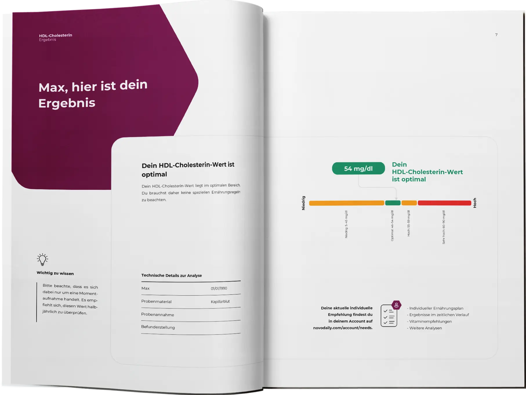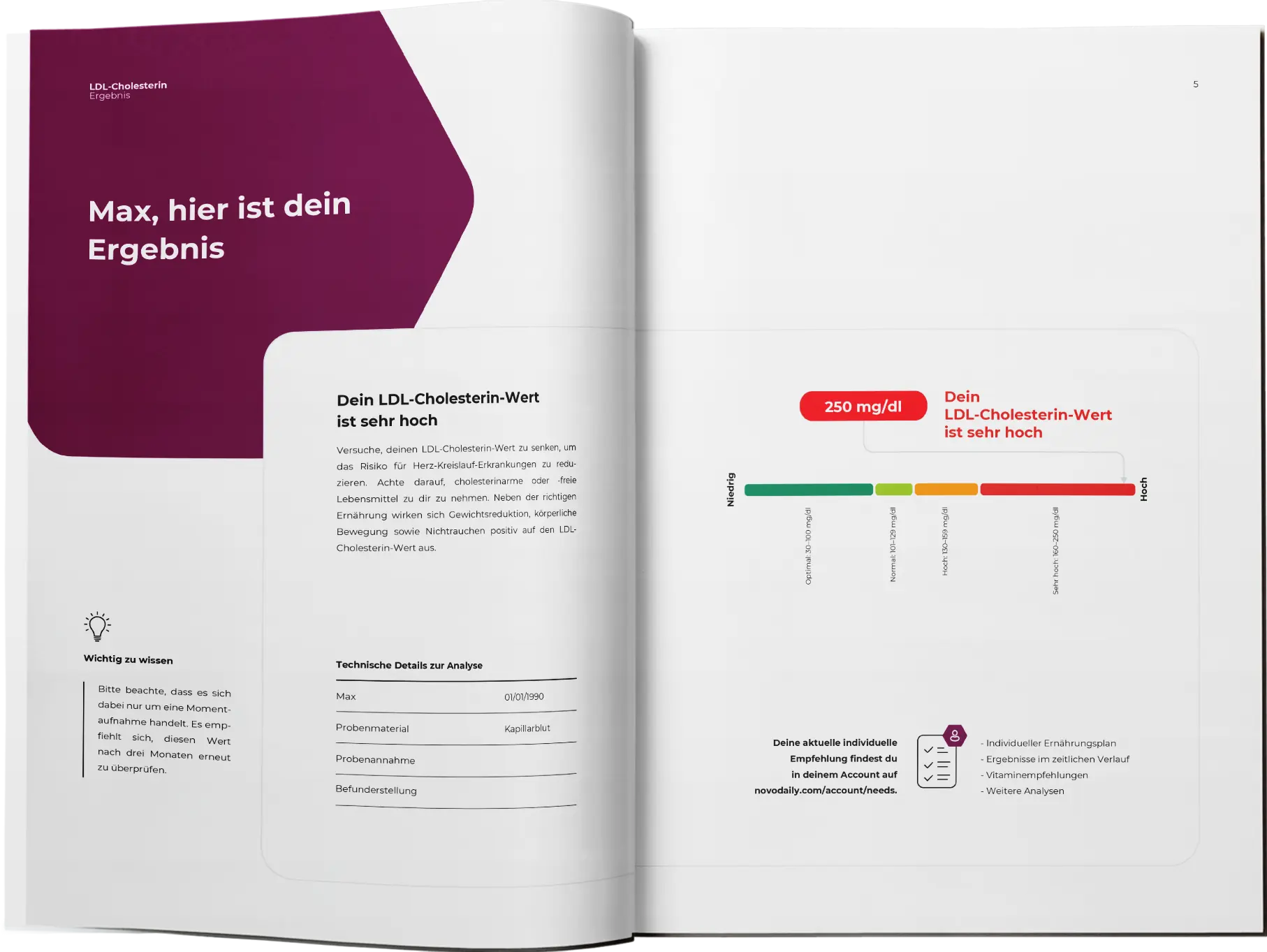 Ungünstige Blutfettwerte können das Risiko für Herz-Kreislauf-Erkrankungen erhöhen. MIt NovoDaily Lipids messen wir die Cholesterin- und Triglyceridwerte in deinem Blut. Anhand der Ergebnisse erfährst du, ob diese wichtigen Gesundheitsparameter im Normalbereich liegen oder ob Handlungsbedarf besteht.