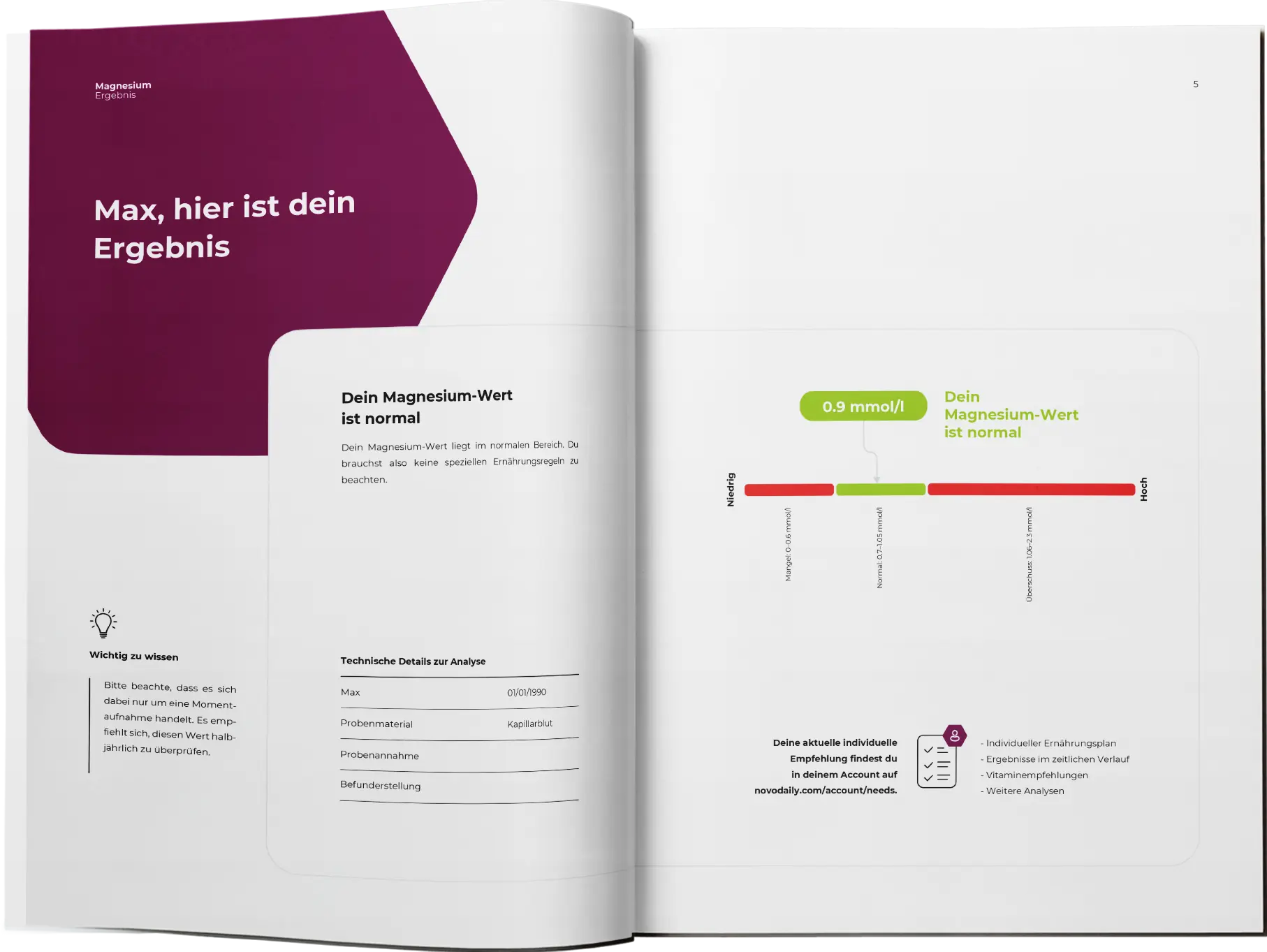 Magnesium spielt eine zentrale Rolle in zahlreichen Vorgängen im Körper. Insbesondere ist es wichtig für eine normale Nerven- und Muskelfunktion. Wir bestimmen mit NovoDaily Magnesium Werte, um festzustellen, ob ein Mangel oder Überschuss dieses Mineralstoffs vorliegt.